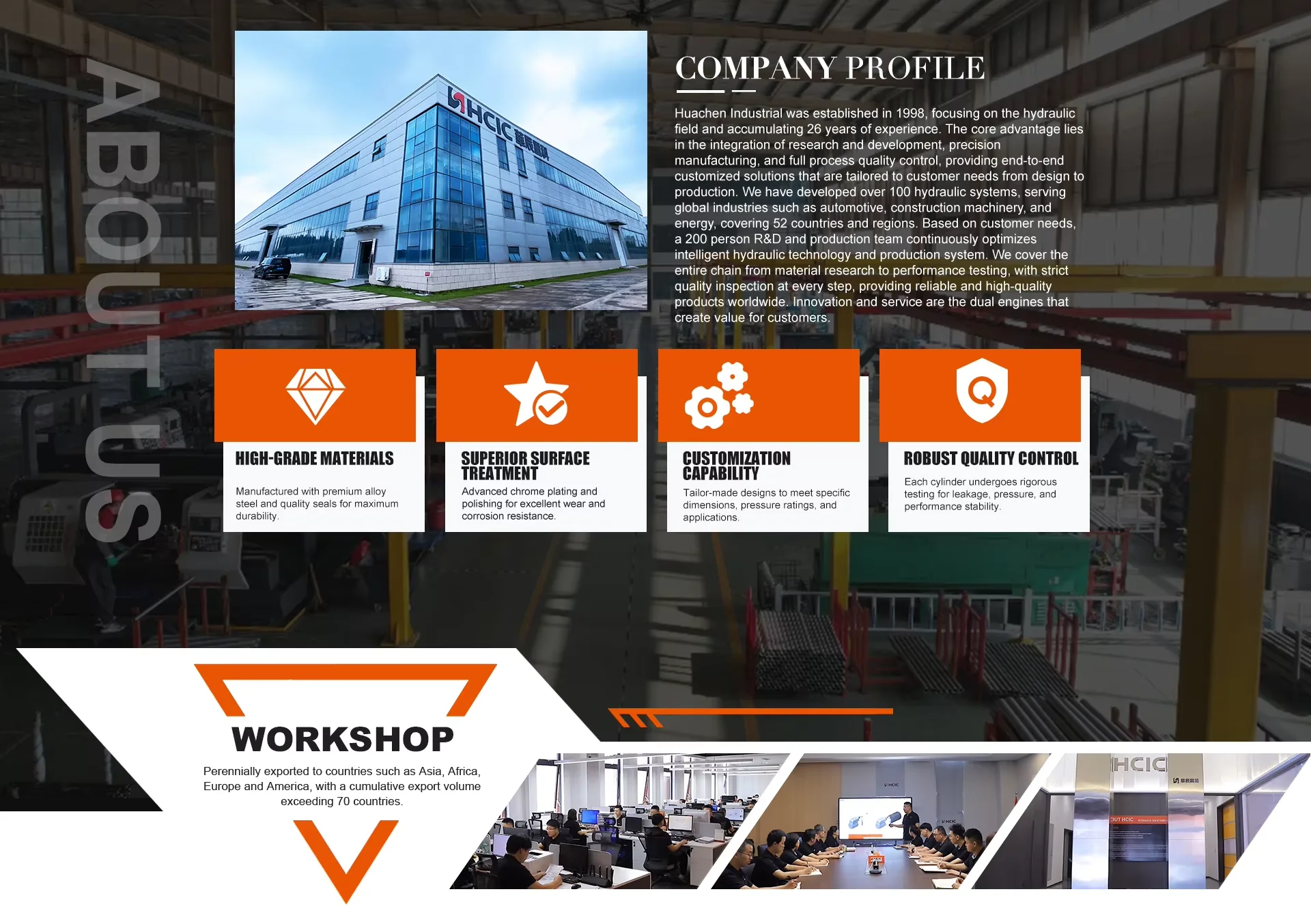 HCIC Hydraulic je profesionálny výrobca hydrauliky, ktorý sa špecializuje na návrh hydraulických systémov, výrobu, inštaláciu, transformáciu, uvedenie do prevádzky a predaj značiek hydraulických komponentov. Ponúkame technické služby a sme odhodlaní poskytovať našim zákazníkom bezpečné a spoľahlivé produkty, ktoré spĺňajú tie najnáročnejšie požiadavky. Inžiniersky tím HCIC úzko spolupracuje so zákazníkmi, aby pochopili ich aplikácie. HCIC Hydraulics s využitím množstva osvedčených konštrukčných metód a pokročilých výrobných zariadení v spojení s bezkonkurenčnými inžinierskymi a výrobnými skúsenosťami vyvíja bezpečné a spoľahlivé hydraulické valce pre kritické aplikácie s podporou bezkonkurenčného zákazníckeho servisu. Navrhujeme, konštruujeme a vyrábame hydraulické valce v najmodernejšom výrobnom zariadení a dodržiavame náš certifikovaný systém manažérstva kvality ISO 9001-2015, aby sme našim zákazníkom zaistili produkty najvyššej kvality.