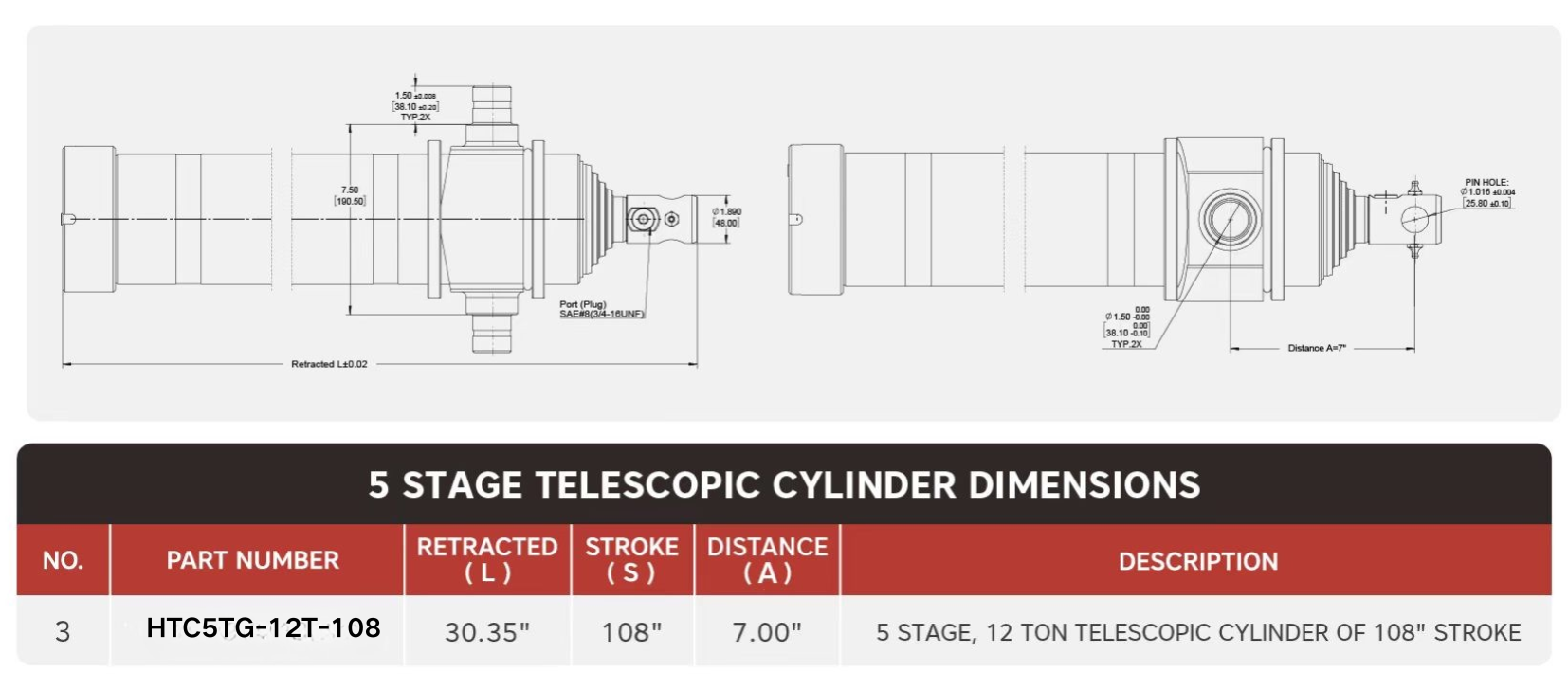 "HTC5TG-12T-108", 5-stupňový, 12-tonový 108" zdvihový teleskopický valec