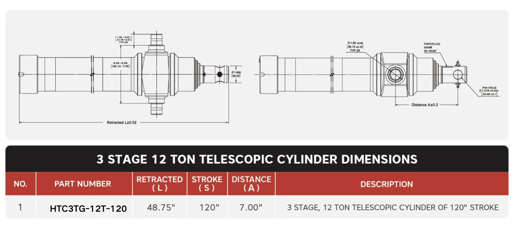 "HTC3TG-12T-120", 3-stupňové, 12 ton 120" zdvihové teleskopické valce