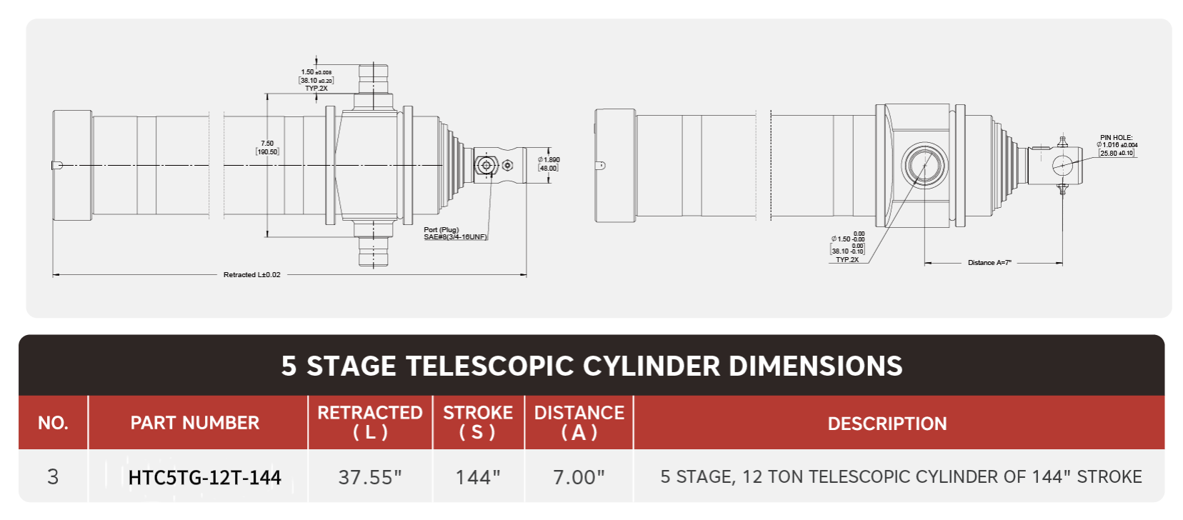 "HTC5TG-12T-144", 5-stupňový, 12-tonový 144" zdvihový teleskopický valec