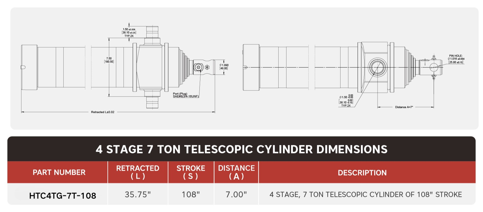 "HTC4TG-7T-108", 4-stupňový, 7-tonový 108" zdvihový teleskopický valec