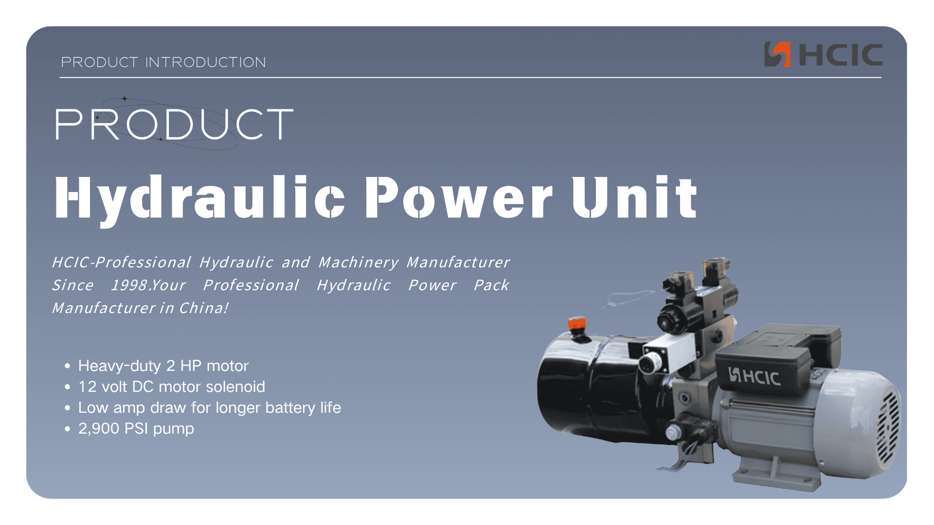 Hydraulická hnacia jednotka HCIC 12V – objem 2,1 cm3, motor 2HP, čerpadlo 2900PSI, váha 40 libier, nízky odber prúdu pre dlhú životnosť batérie, ideálne pre jednosmerné hydraulické systémy.