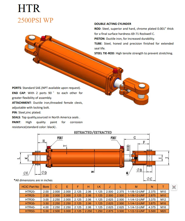 Tento štandardný vidlicový valec HCIC má 4" vŕtanie, 36" zdvih a tyč s priemerom 2". Dvojčinné Pracovné porty SAE 8 (-08) ORB(F). Maximálny pracovný tlak 2 500 PSI Clevis montáže Vrátane 1" montážnych kolíkov Lesklá čierna farba je odolná a odoláva vyblednutiu